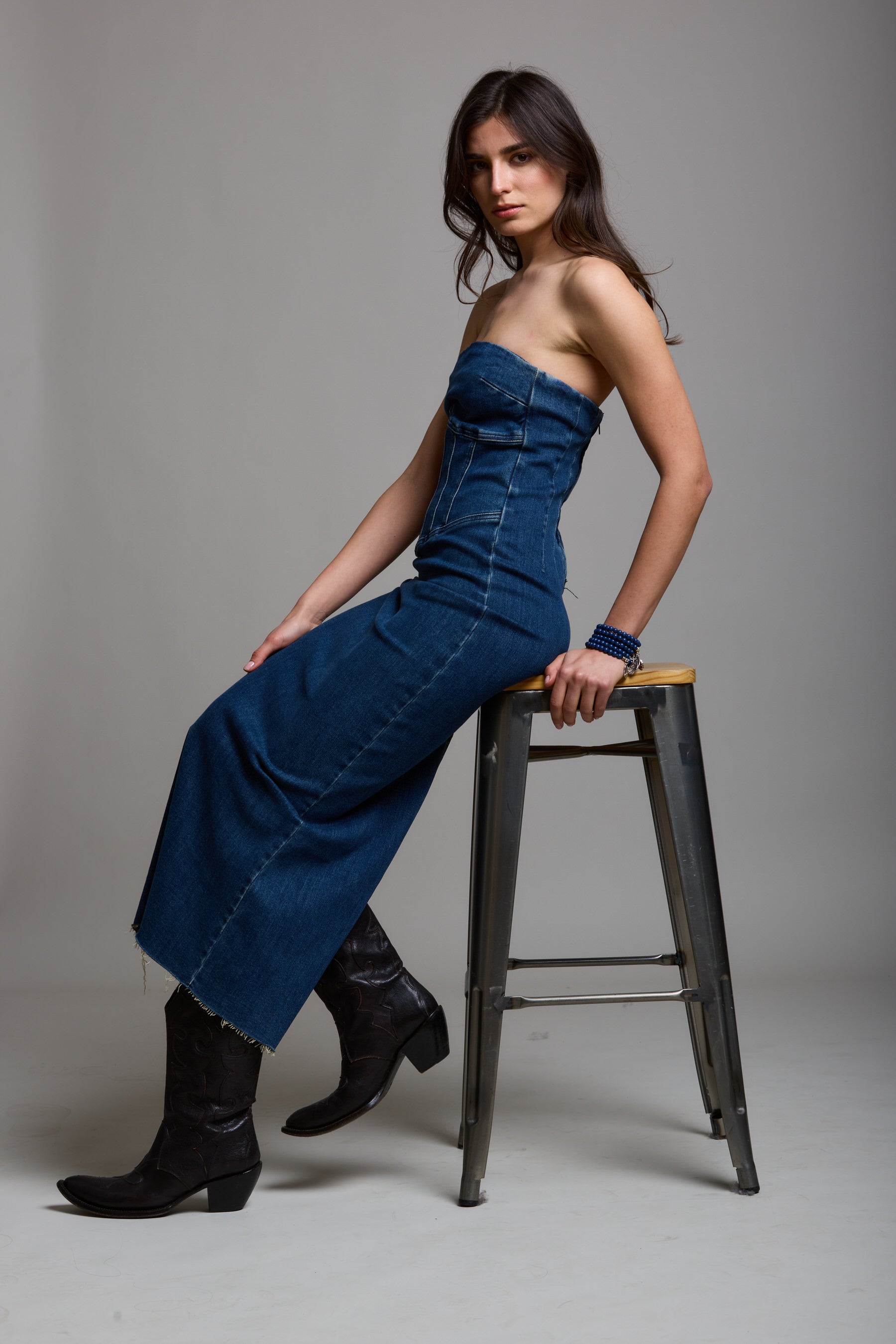 Dieses trägerlose Denim -Kleid ist hinten aufgeteilt und schließt sich mit einem Reißverschluss im Rücken, um einen eleganten und originellen Stil zu präsentieren.