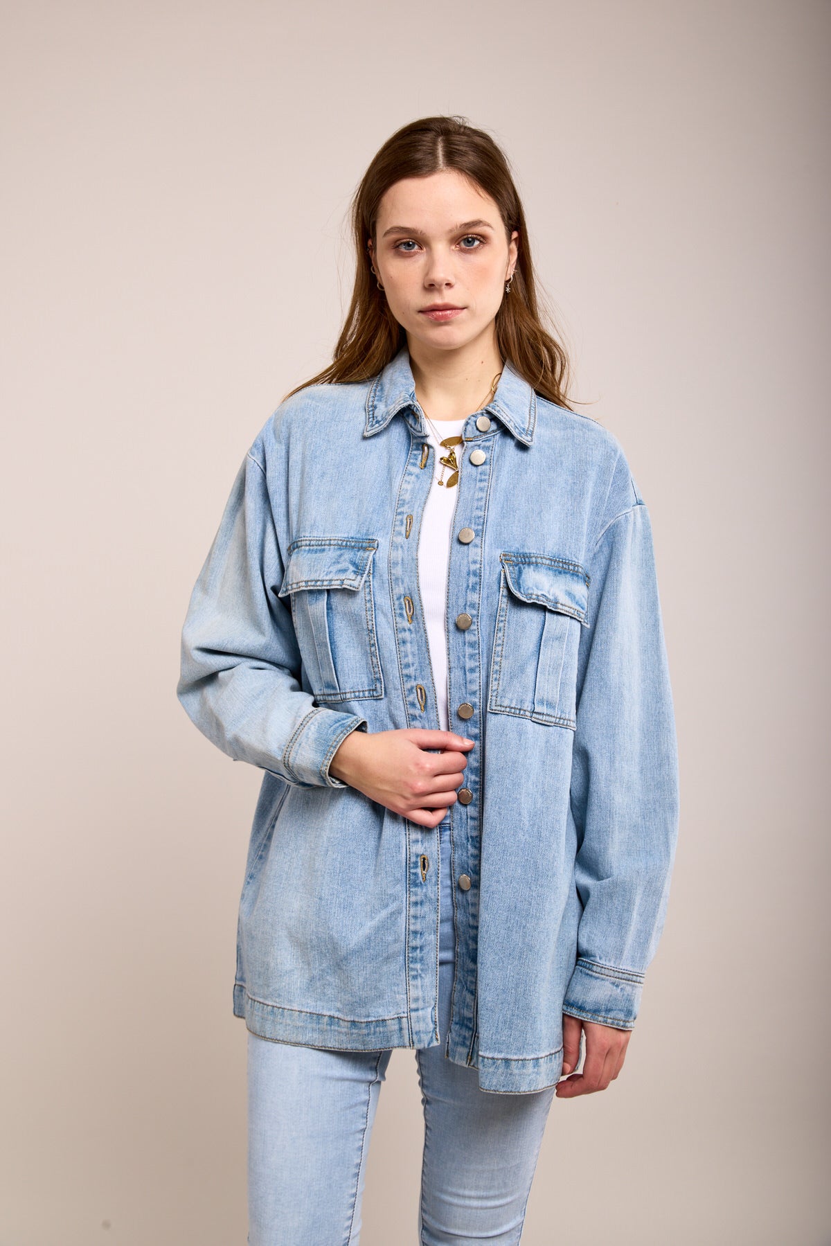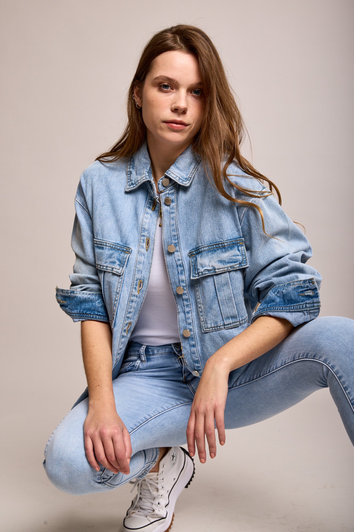 Diese mittlere Jeansjacke bietet zwei genähte Taschen und einen Knopfverschluss in einer leichten ausgewaschenen Farbe.