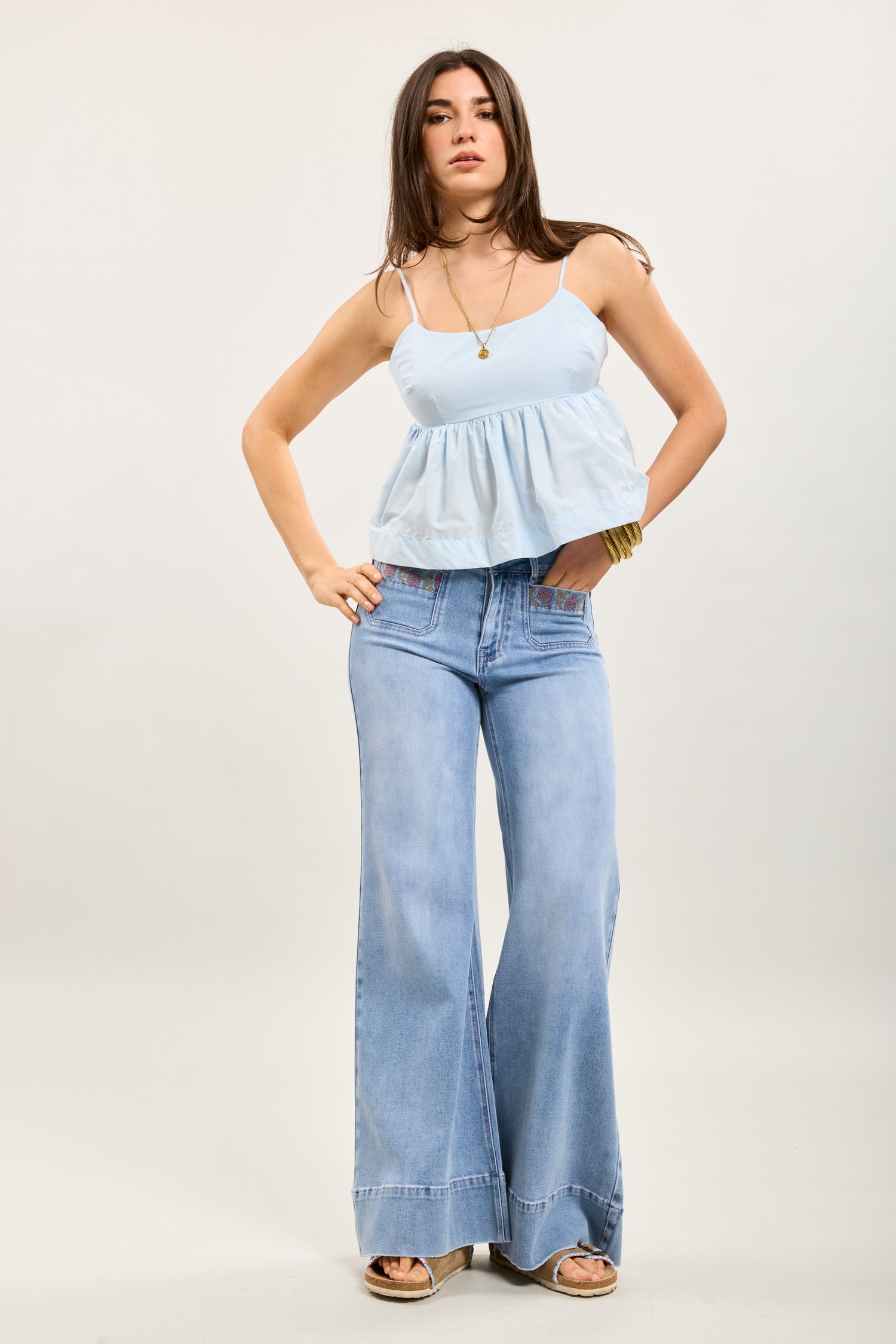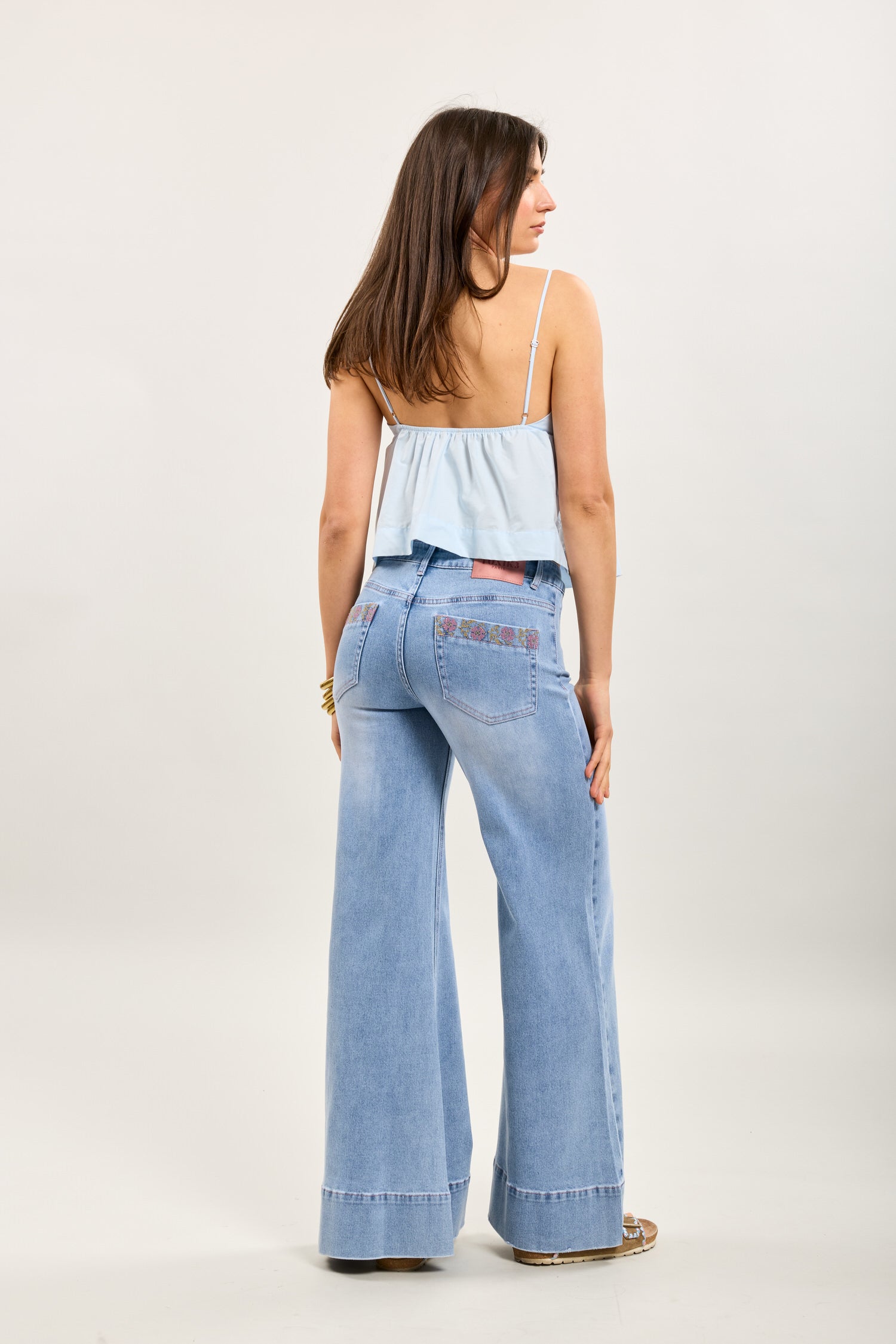 Toxik3 stretch jean pants wide pockets embroidered flowers