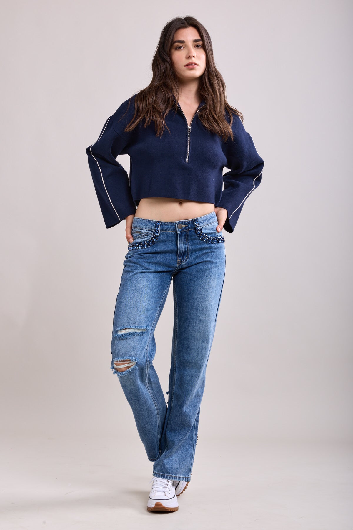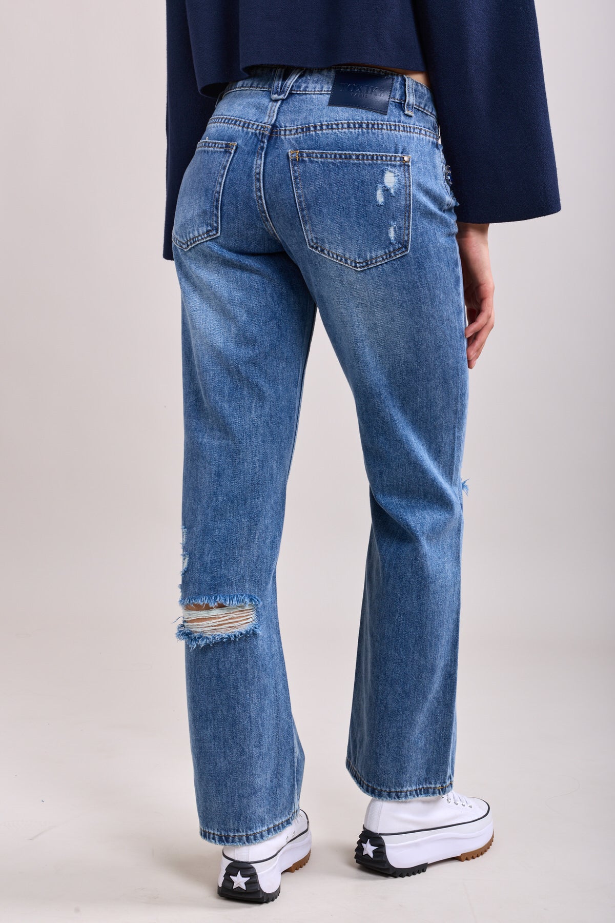 This worn jeans with a rebellious style is distinguished by his jewelry delicately encrusted on the edges of the front pockets, adding a precious touch to the whole. The tears on the back of denim strengthen its daring character.
