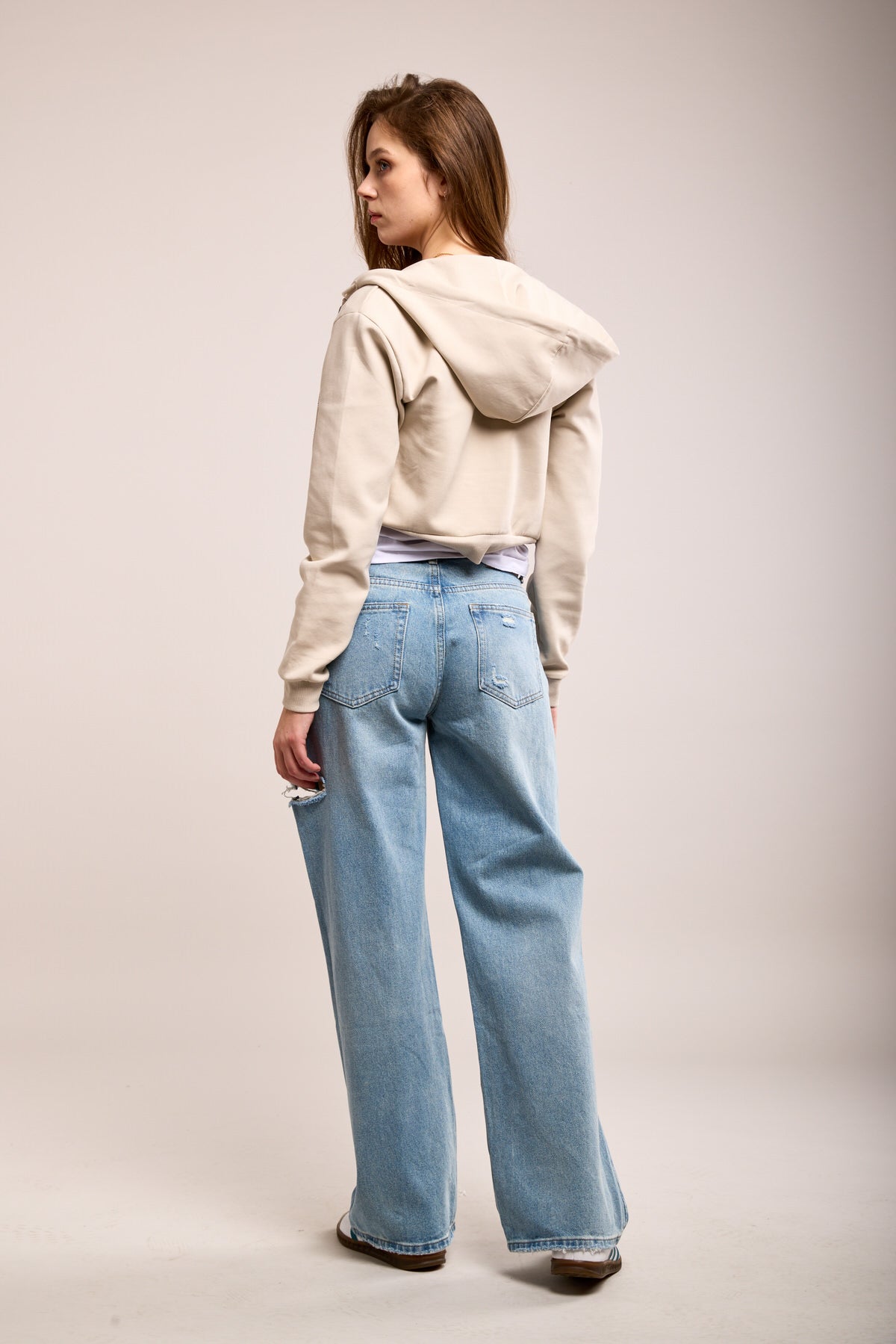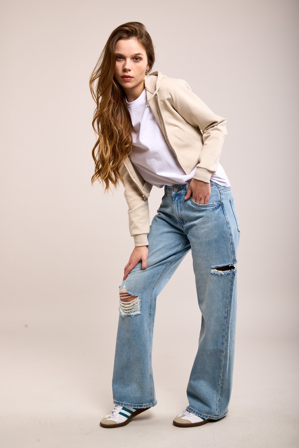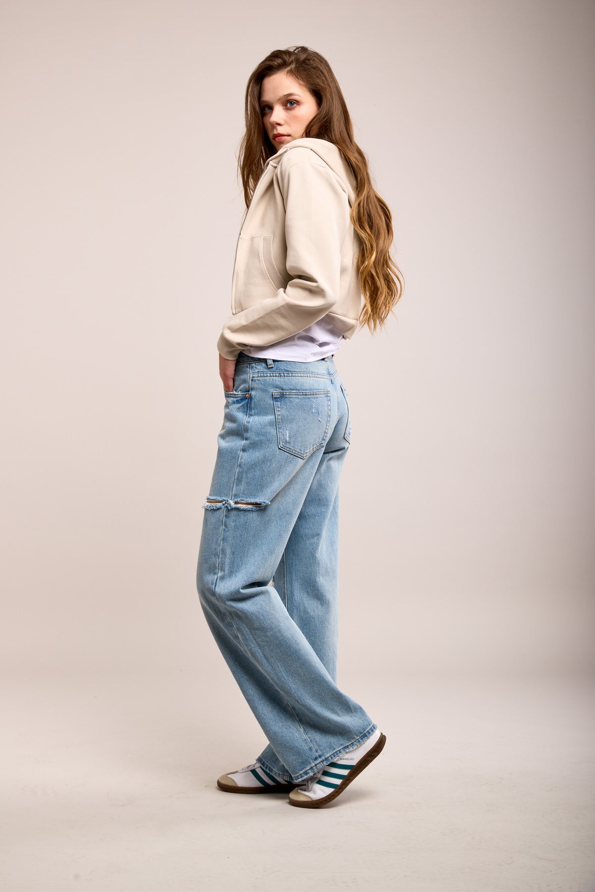 Le jean Collette est déchiré avec soin au genou et d'une manière franche sur le côté pour un look moderne.
