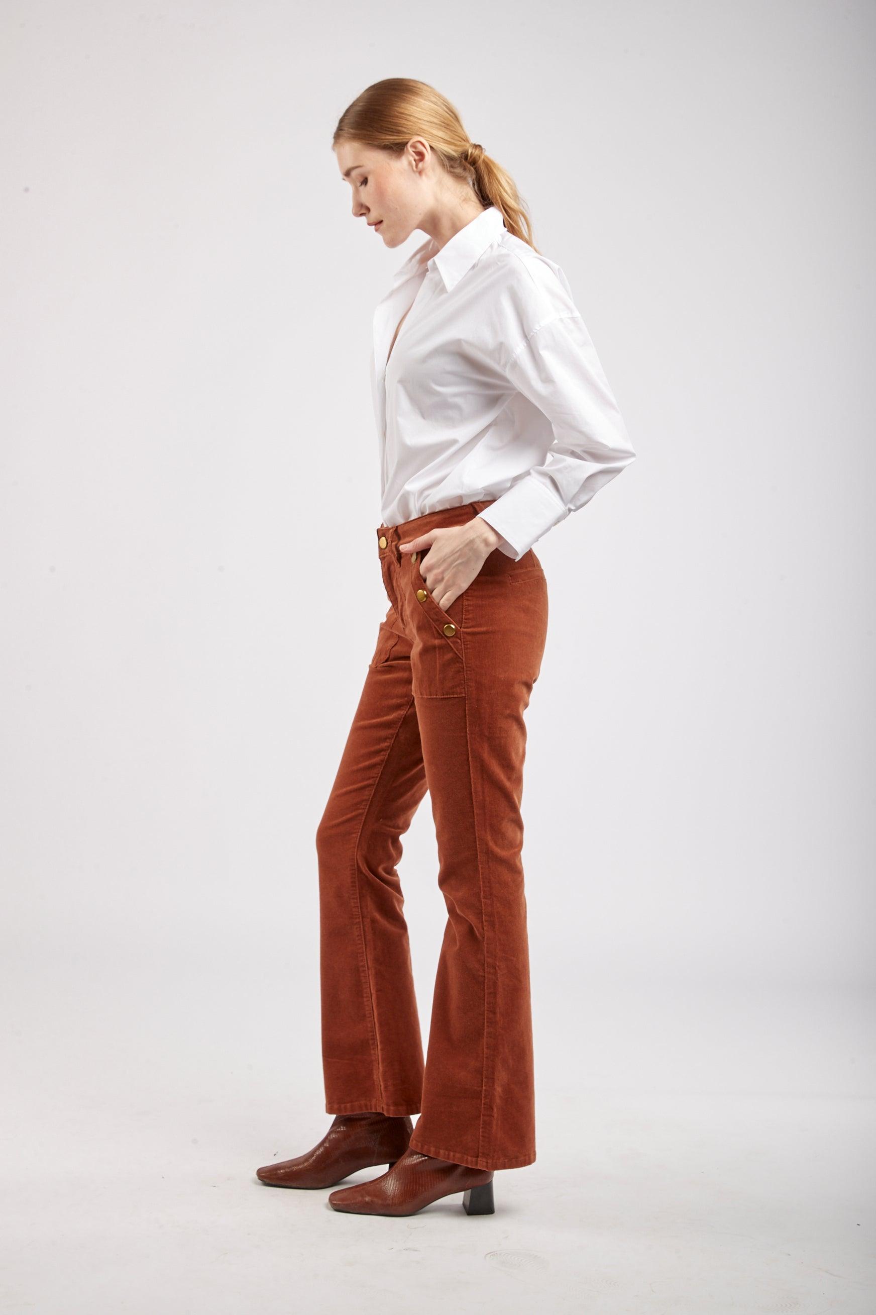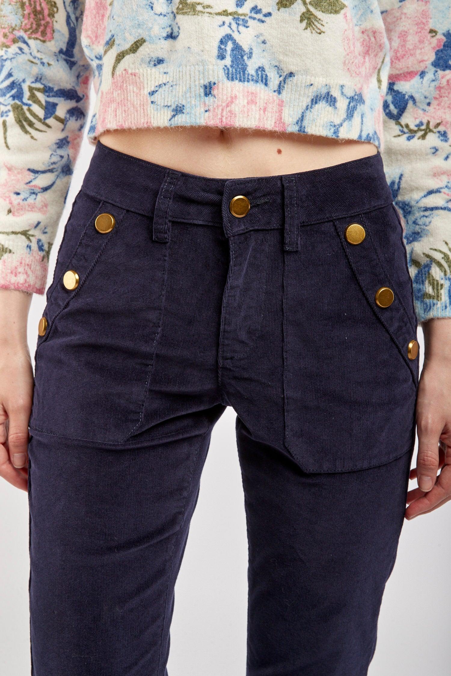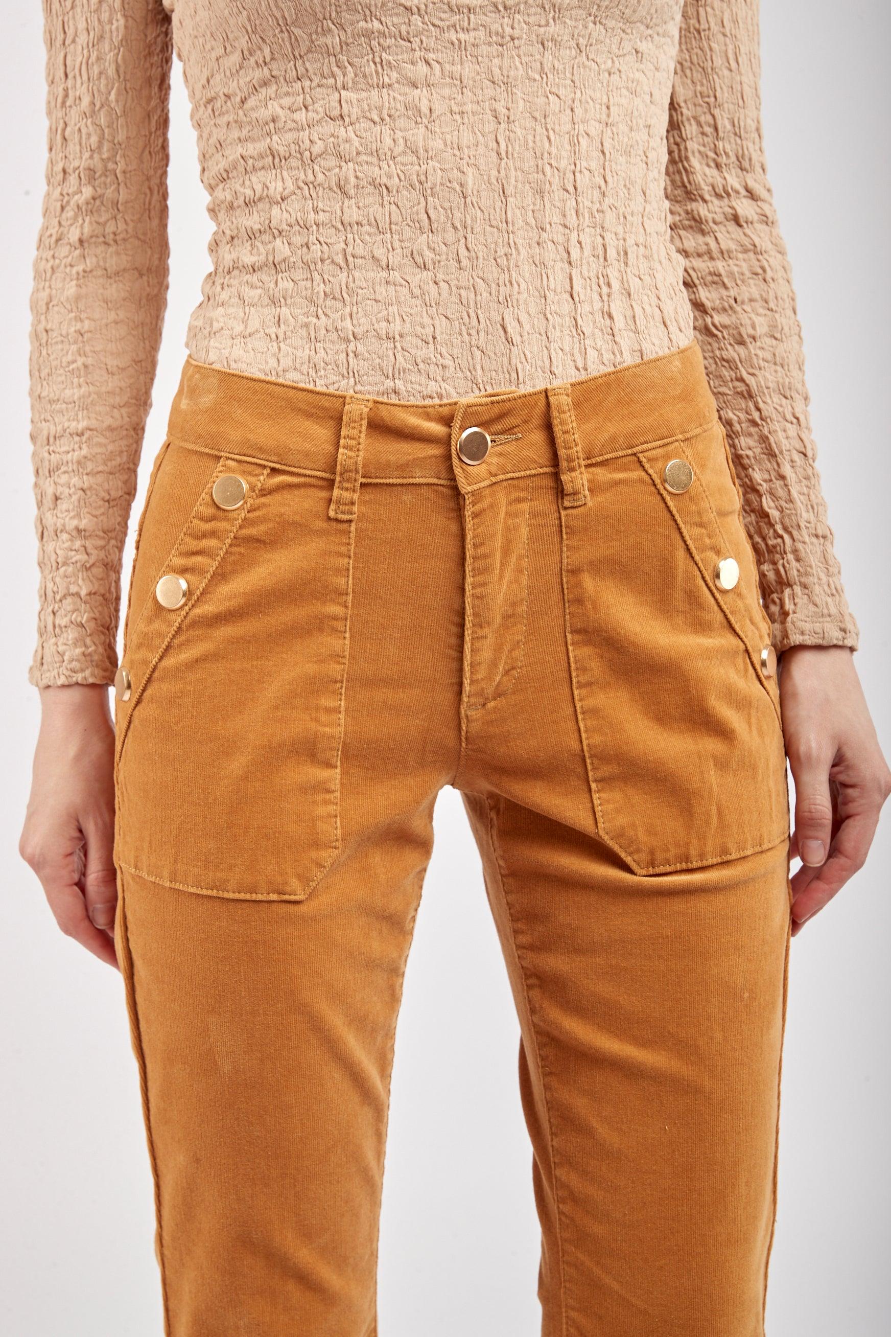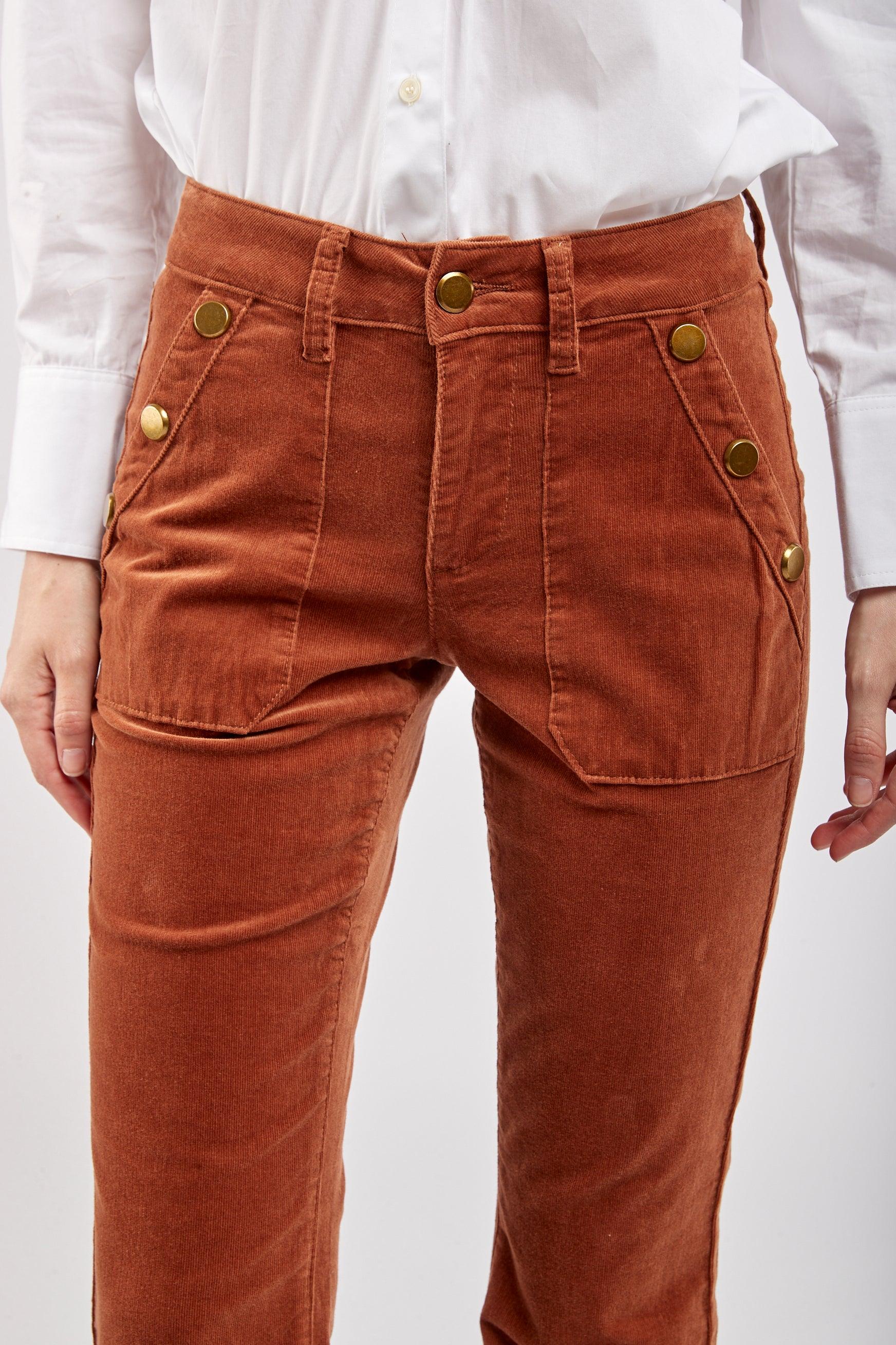 Le pantalon en velours propose une coupe de type flare et une fermeture par zip. Il se distingue par ses grandes poches et de ses 3 boutons décoratifs en or à l'avant.
