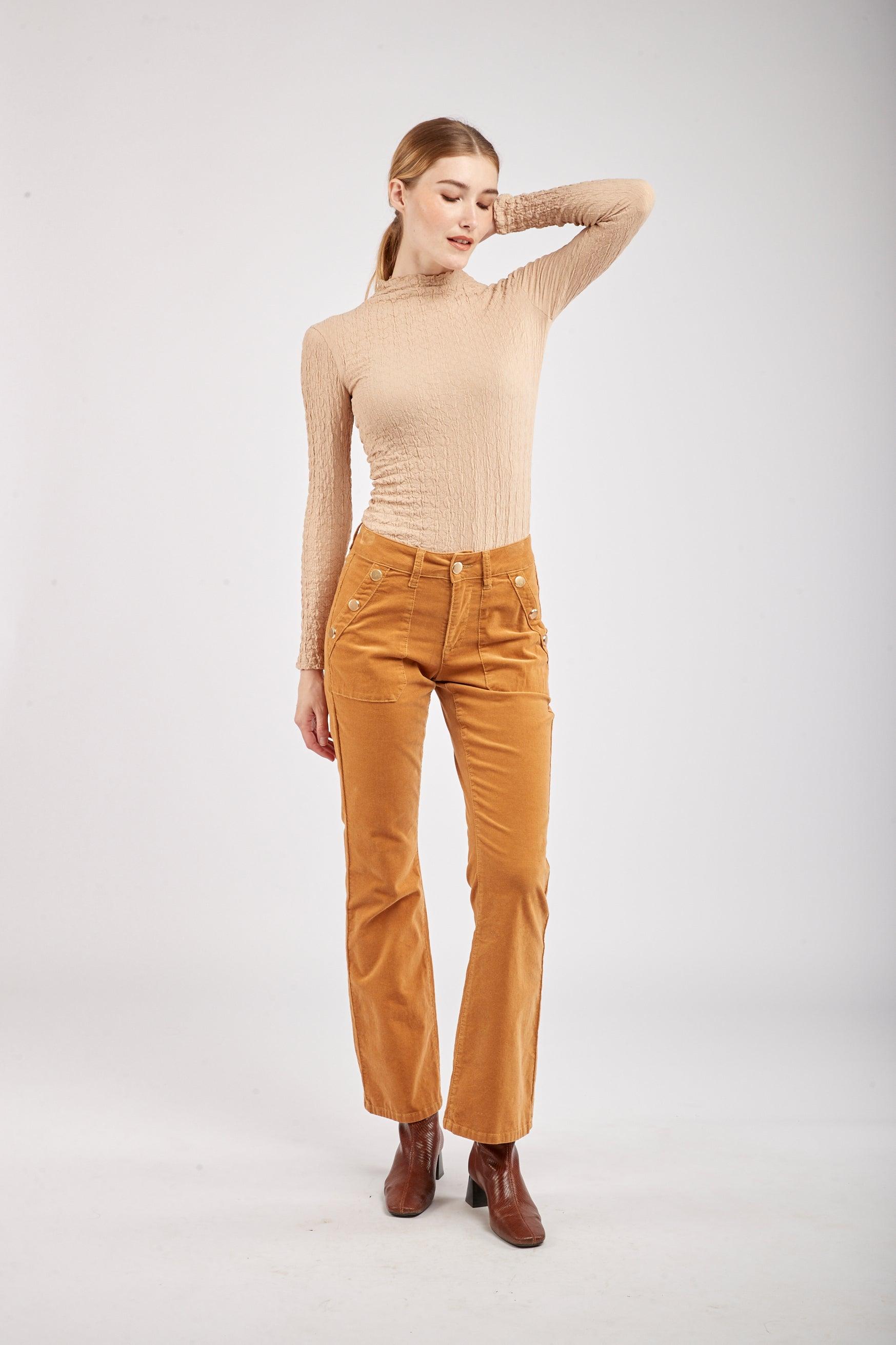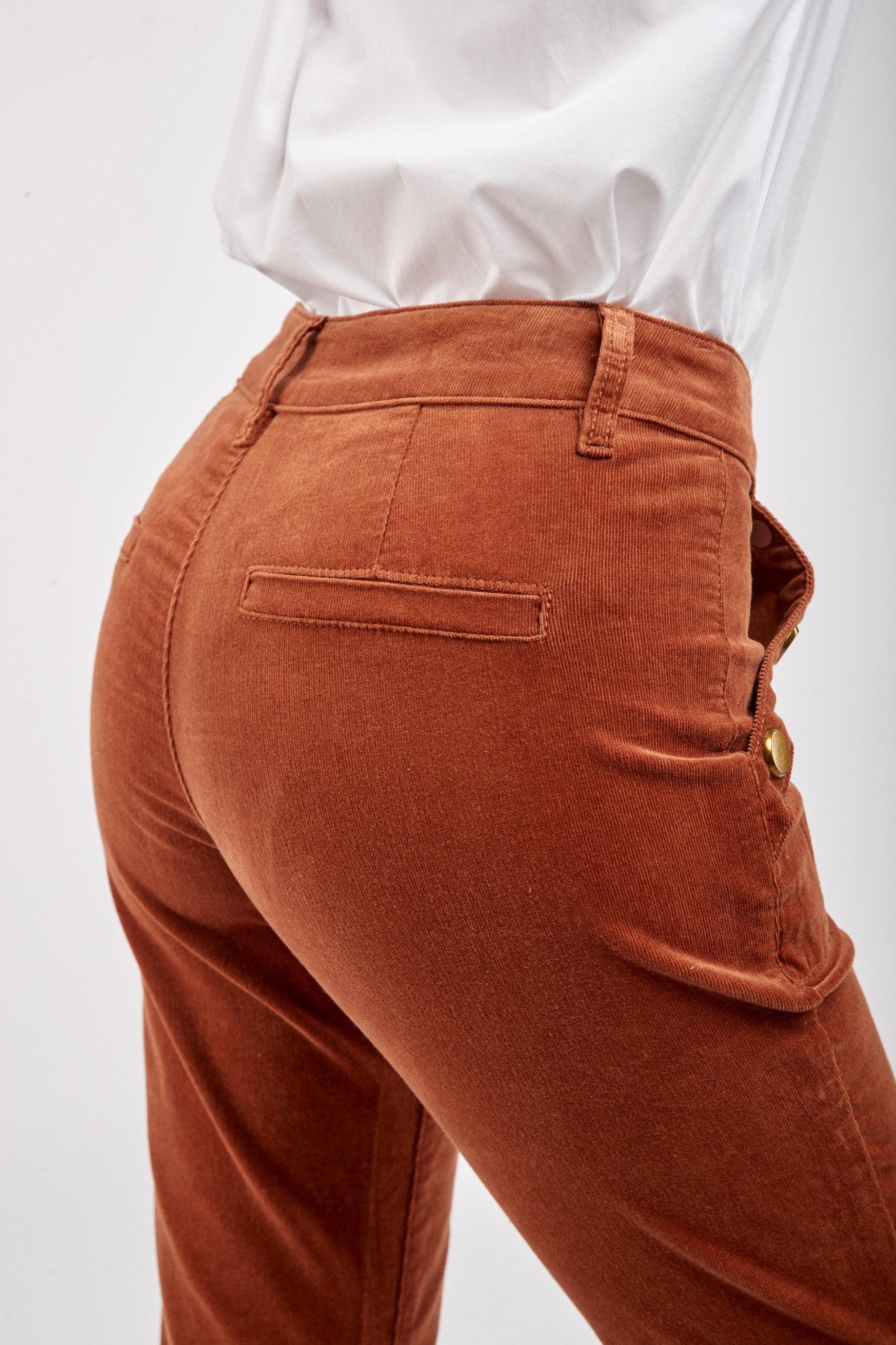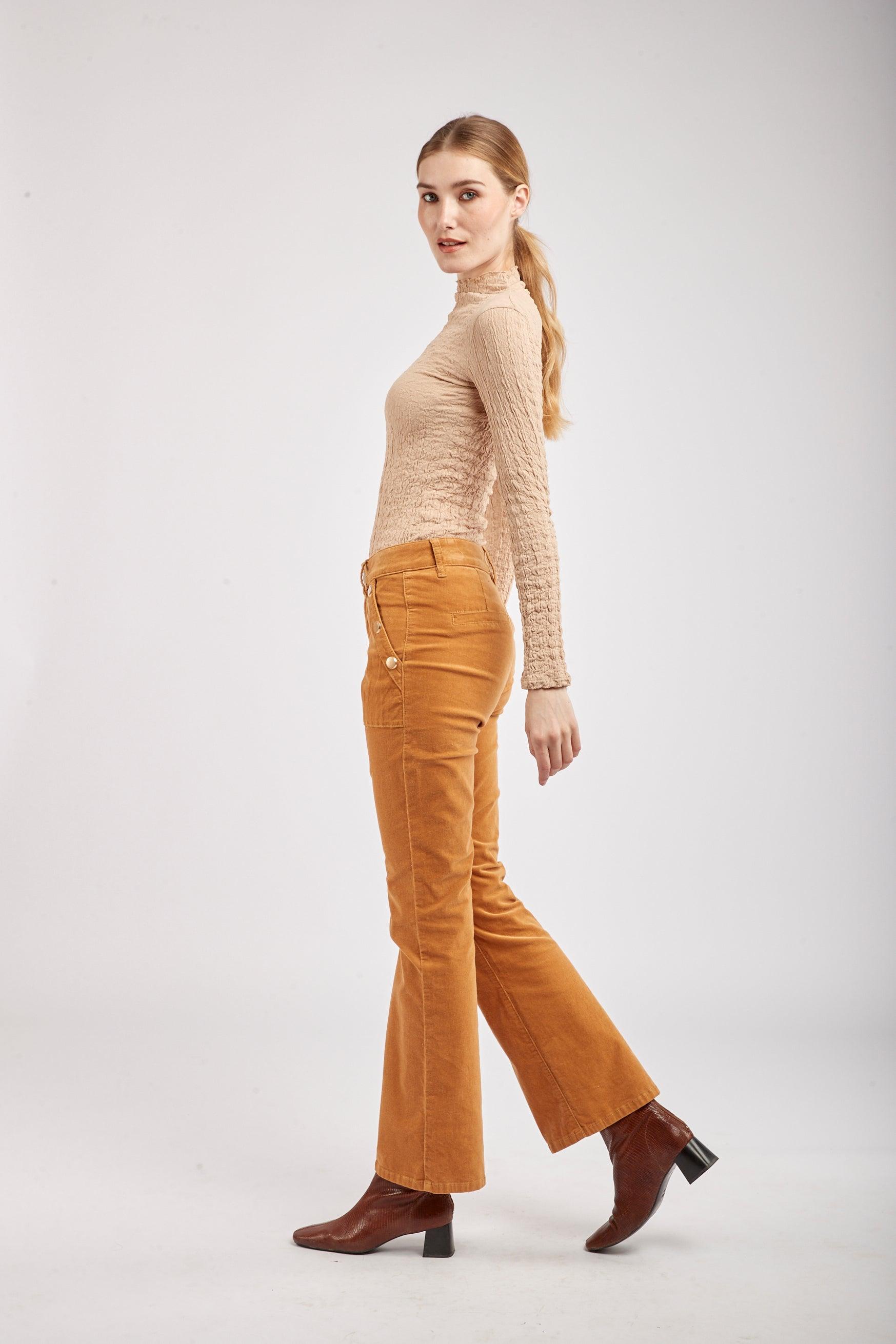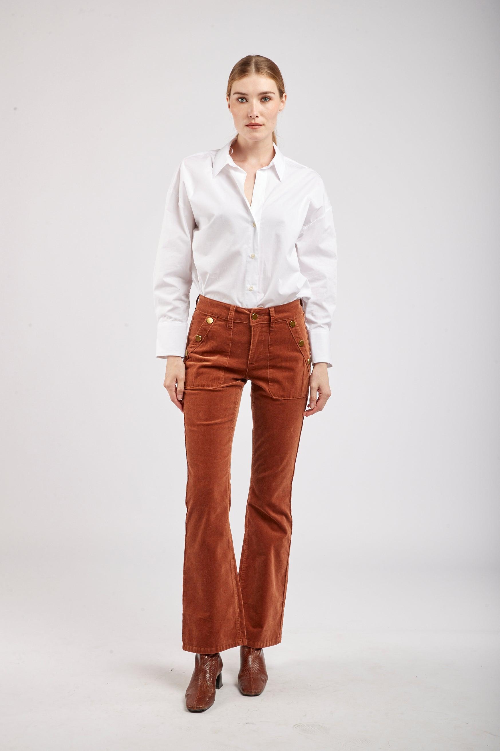 Le pantalon en velours propose une coupe de type flare et une fermeture par zip. Il se distingue par ses grandes poches et de ses 3 boutons décoratifs en or à l'avant.
