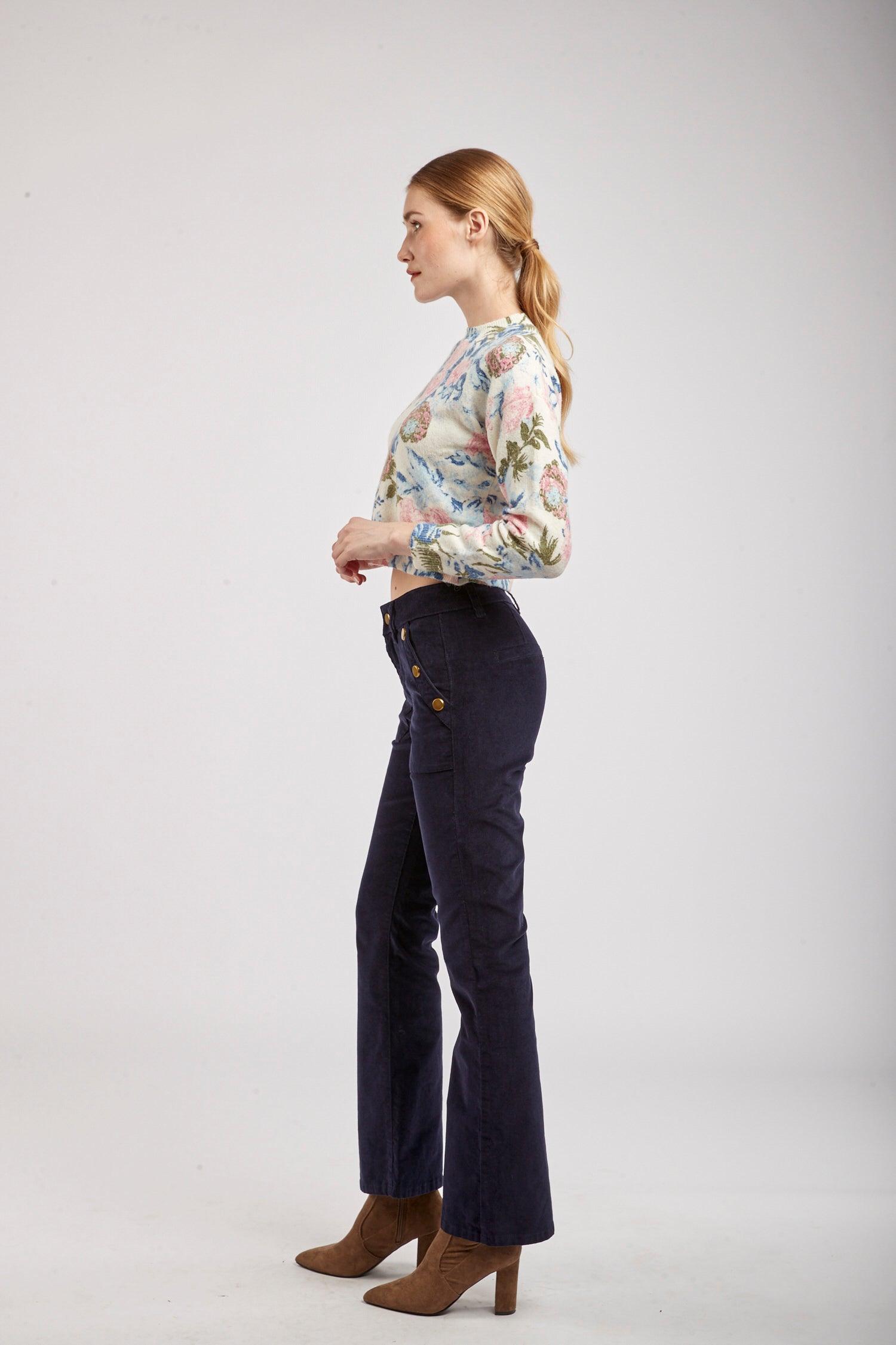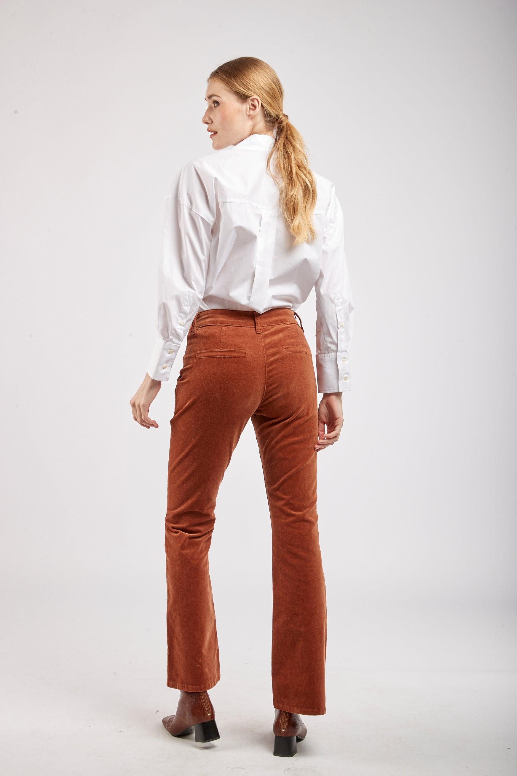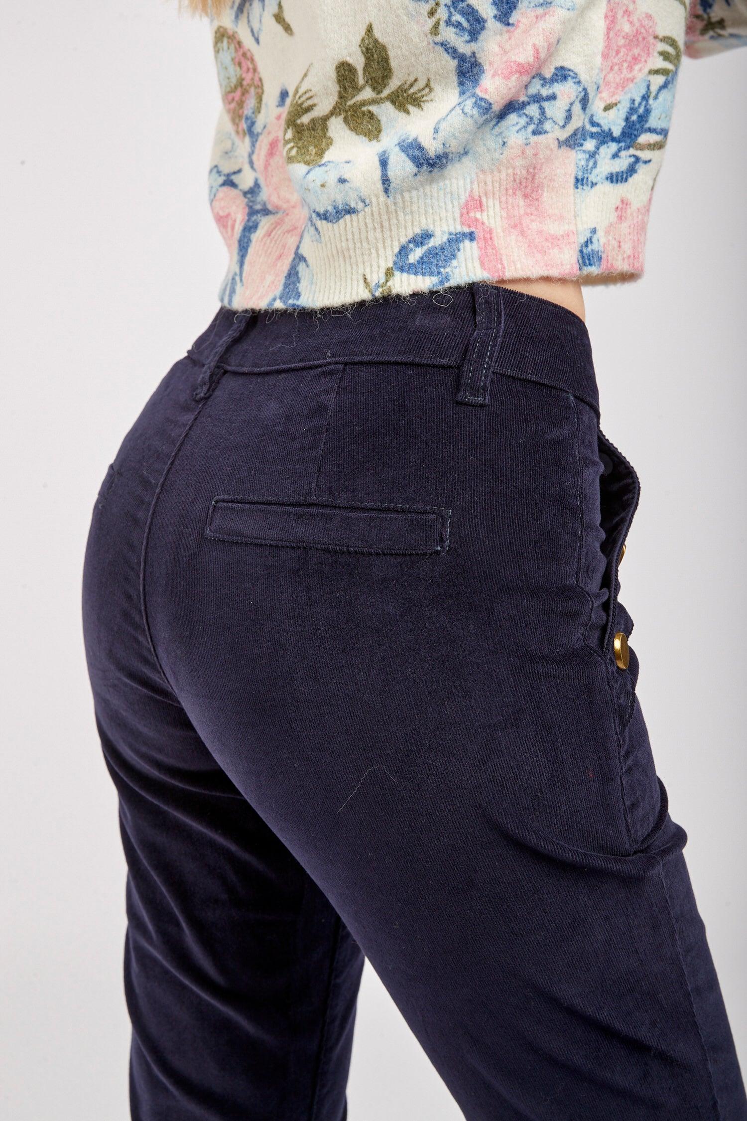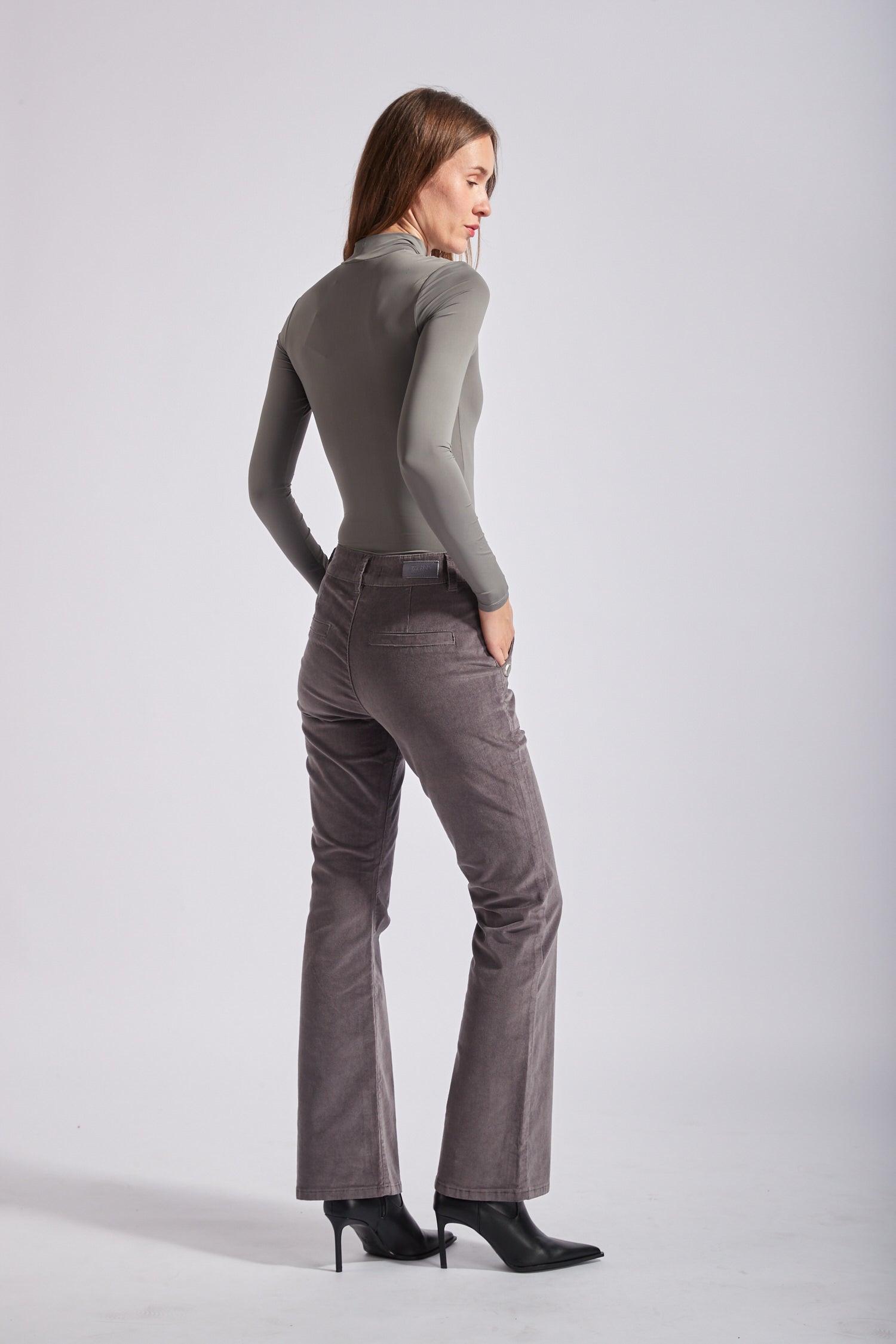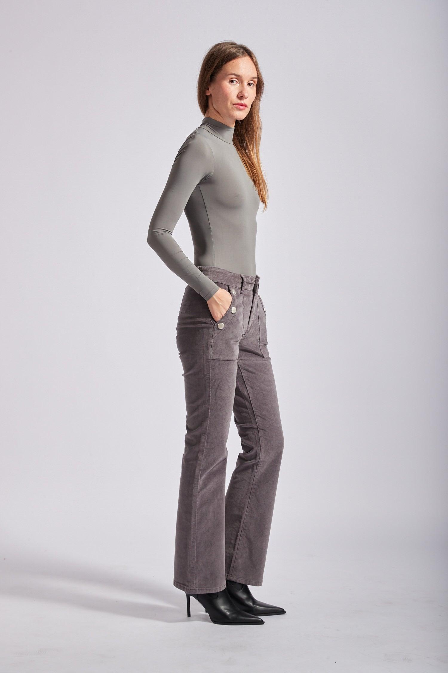 Le pantalon en velours propose une coupe de type flare et une fermeture par zip. Il se distingue par ses grandes poches et de ses 3 boutons décoratifs en or à l'avant.