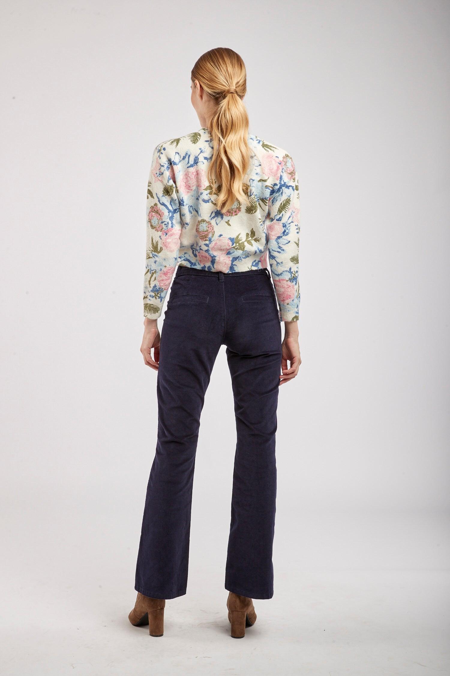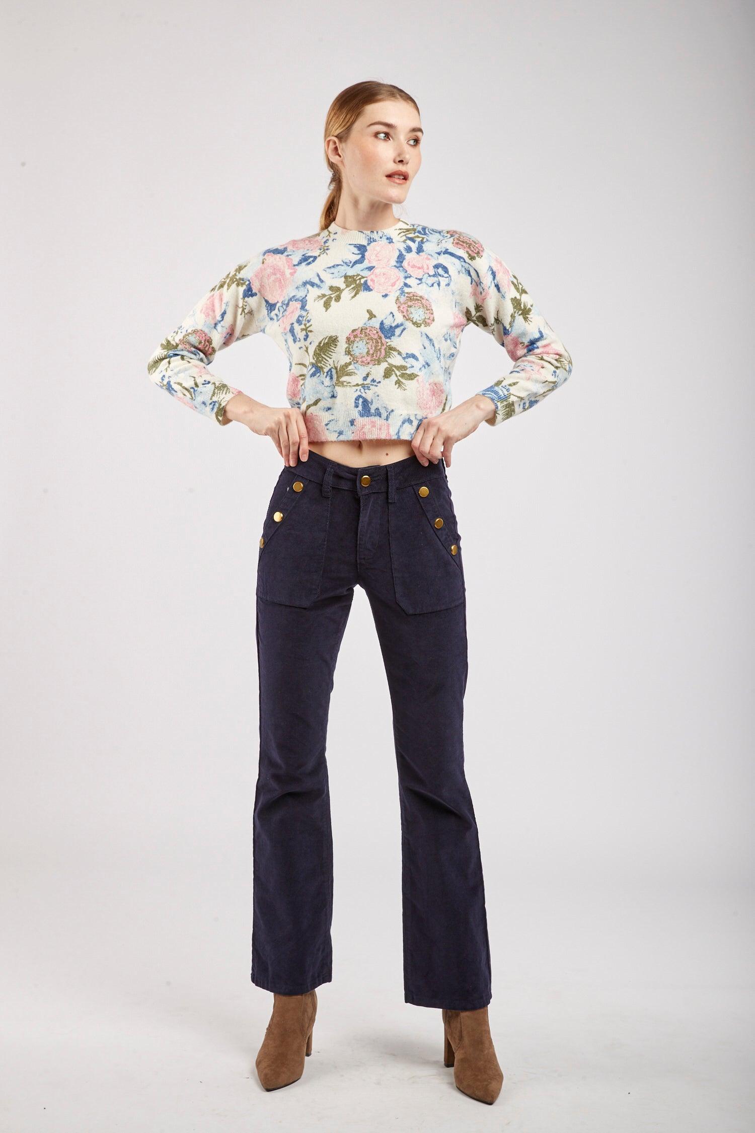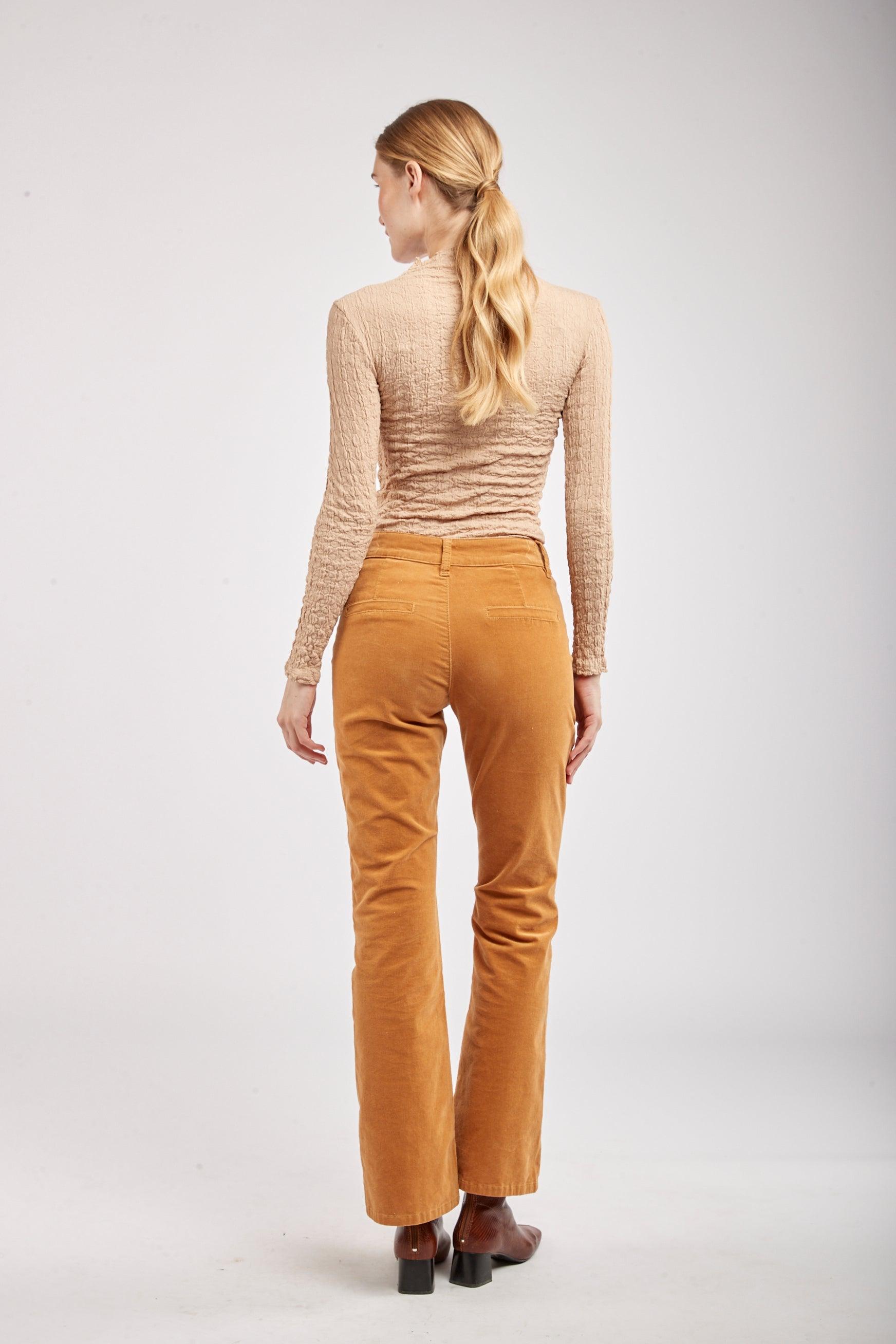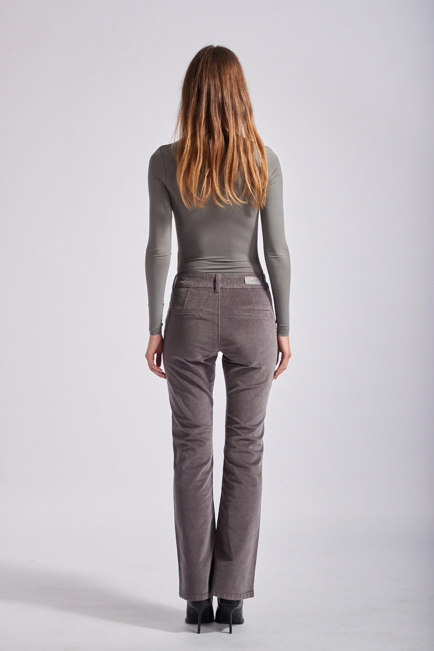 Le pantalon en velours propose une coupe de type flare et une fermeture par zip. Il se distingue par ses grandes poches et de ses 3 boutons décoratifs en or à l'avant.