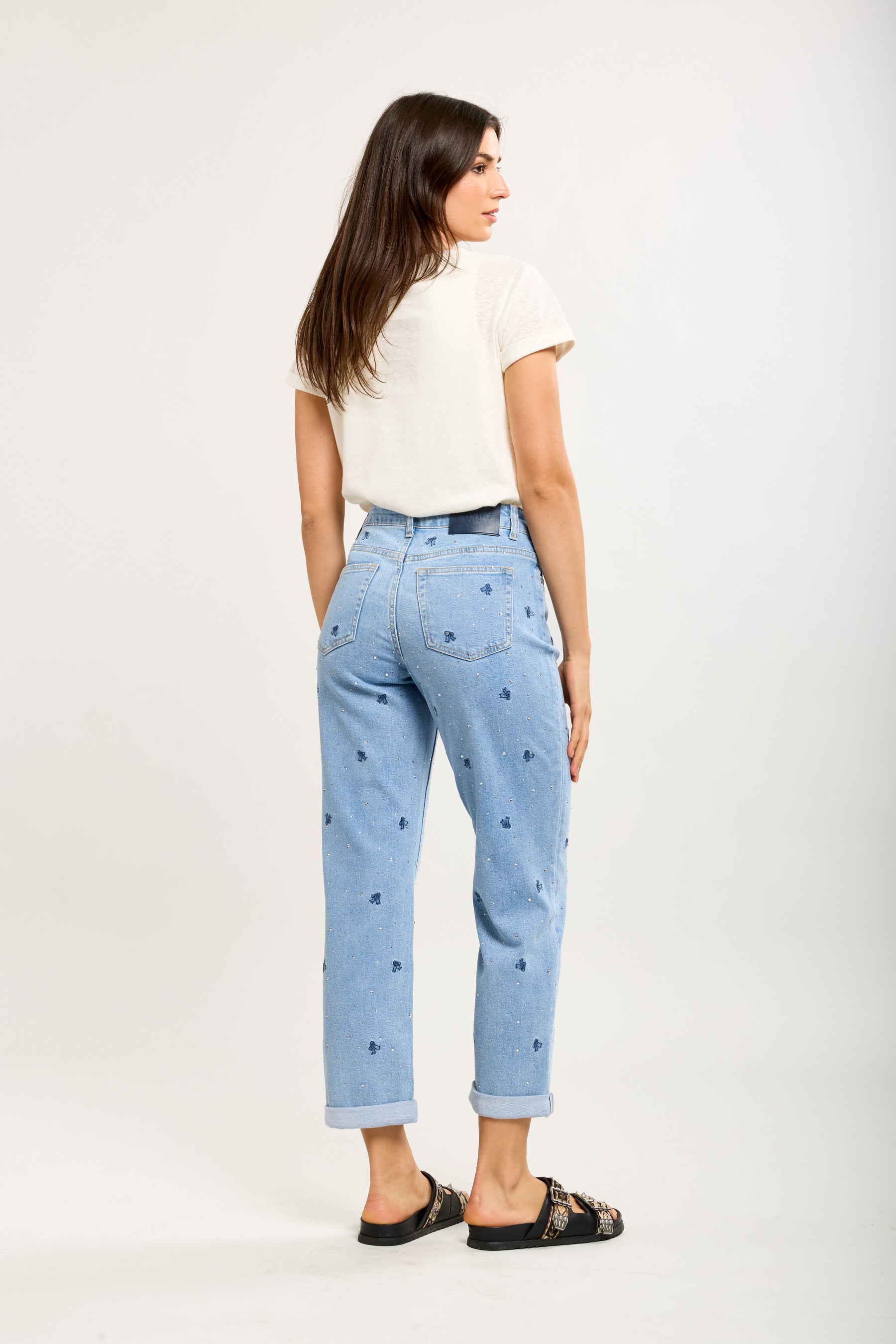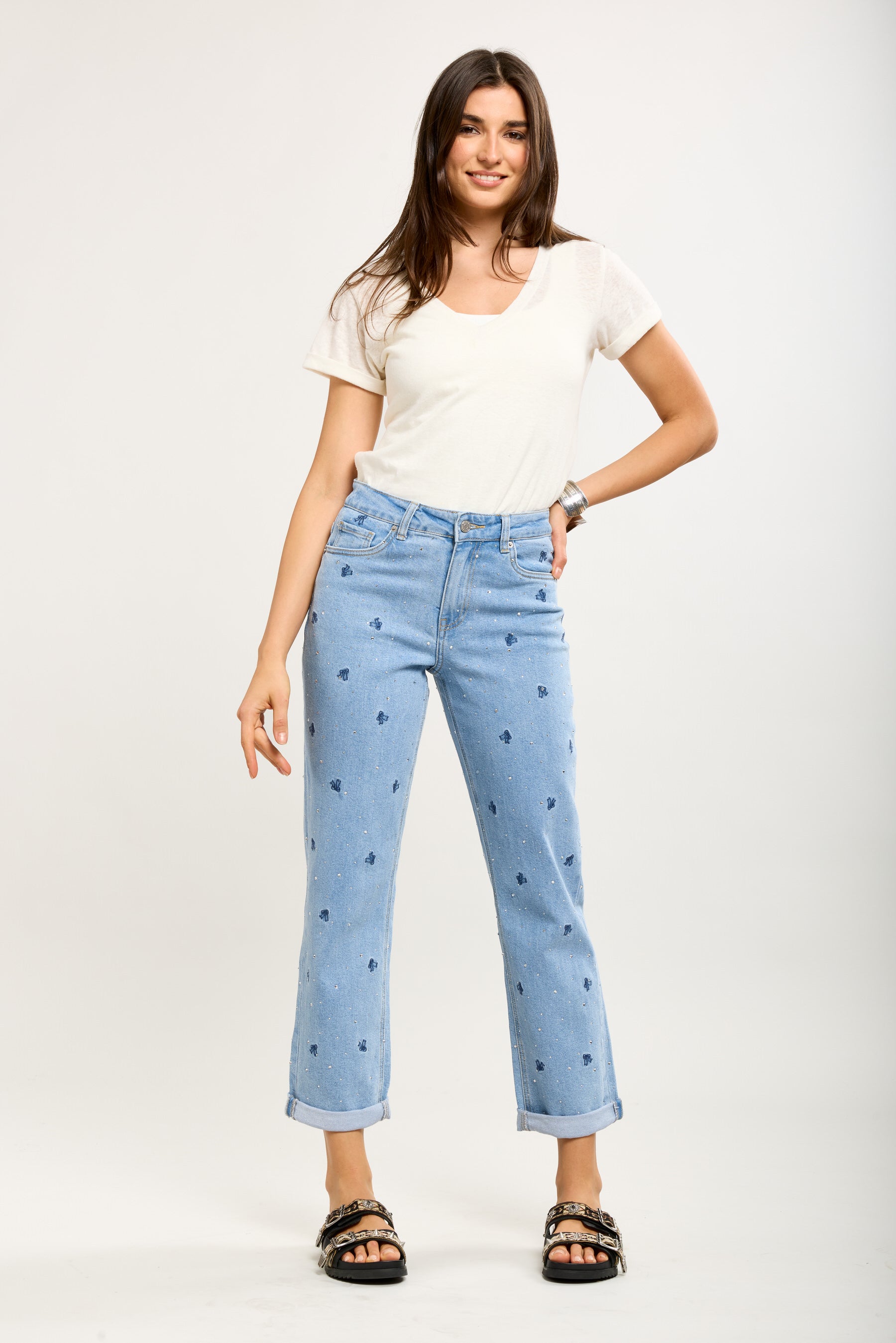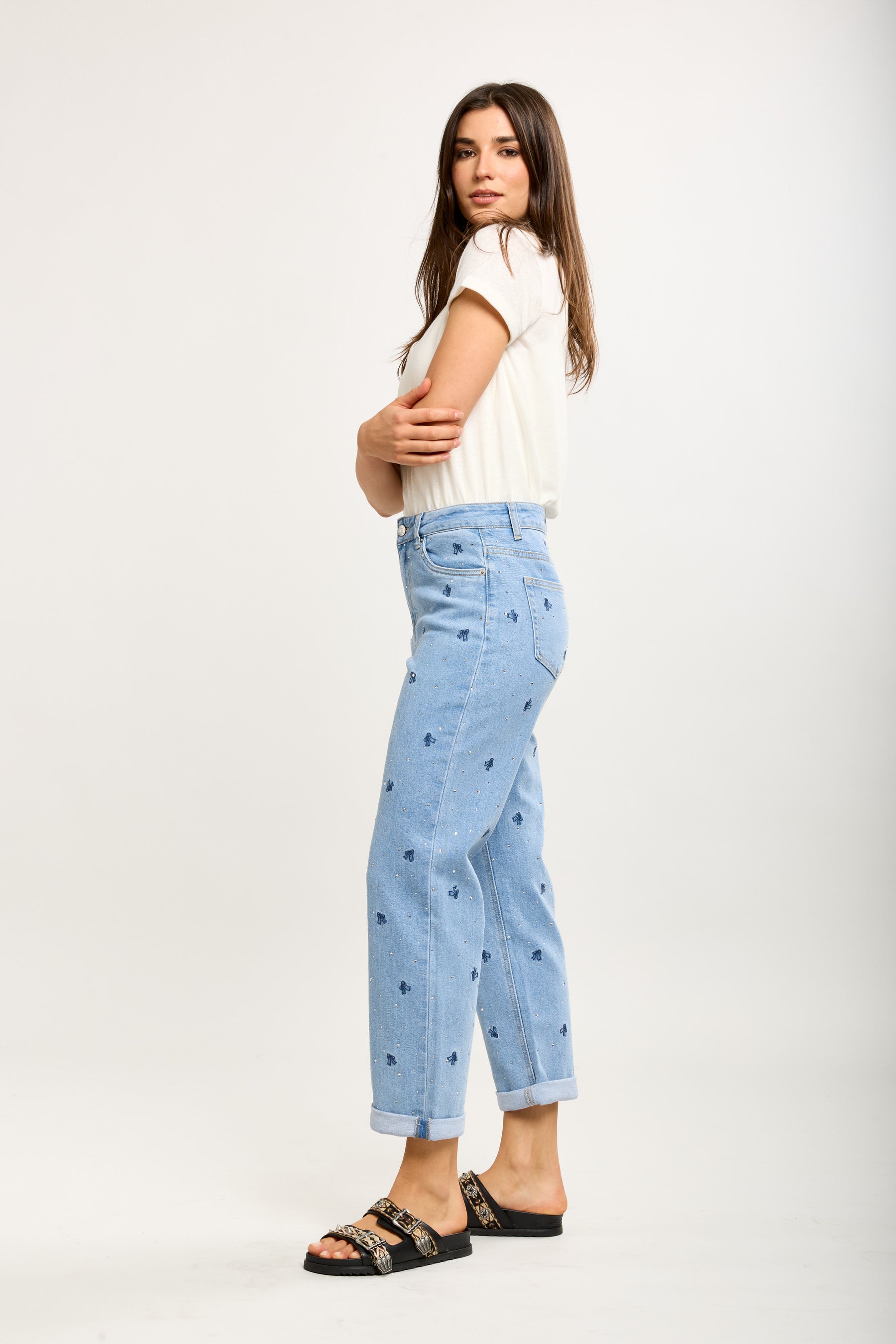 Toxik3 mombroek van stretchdenim met strasssteentjes en strikborduursel