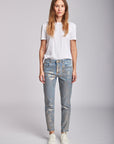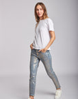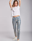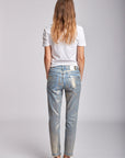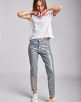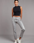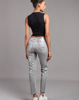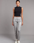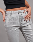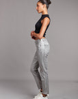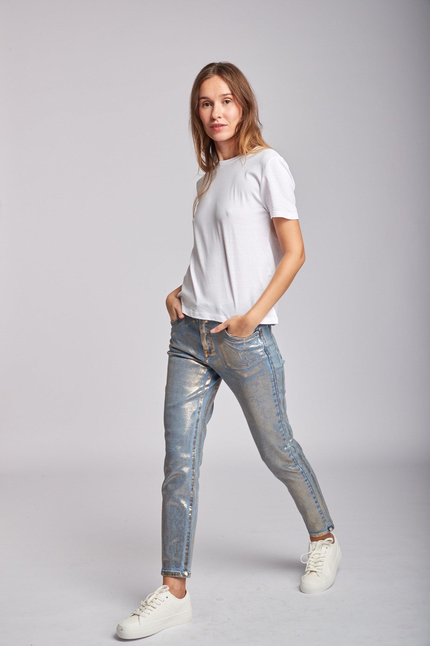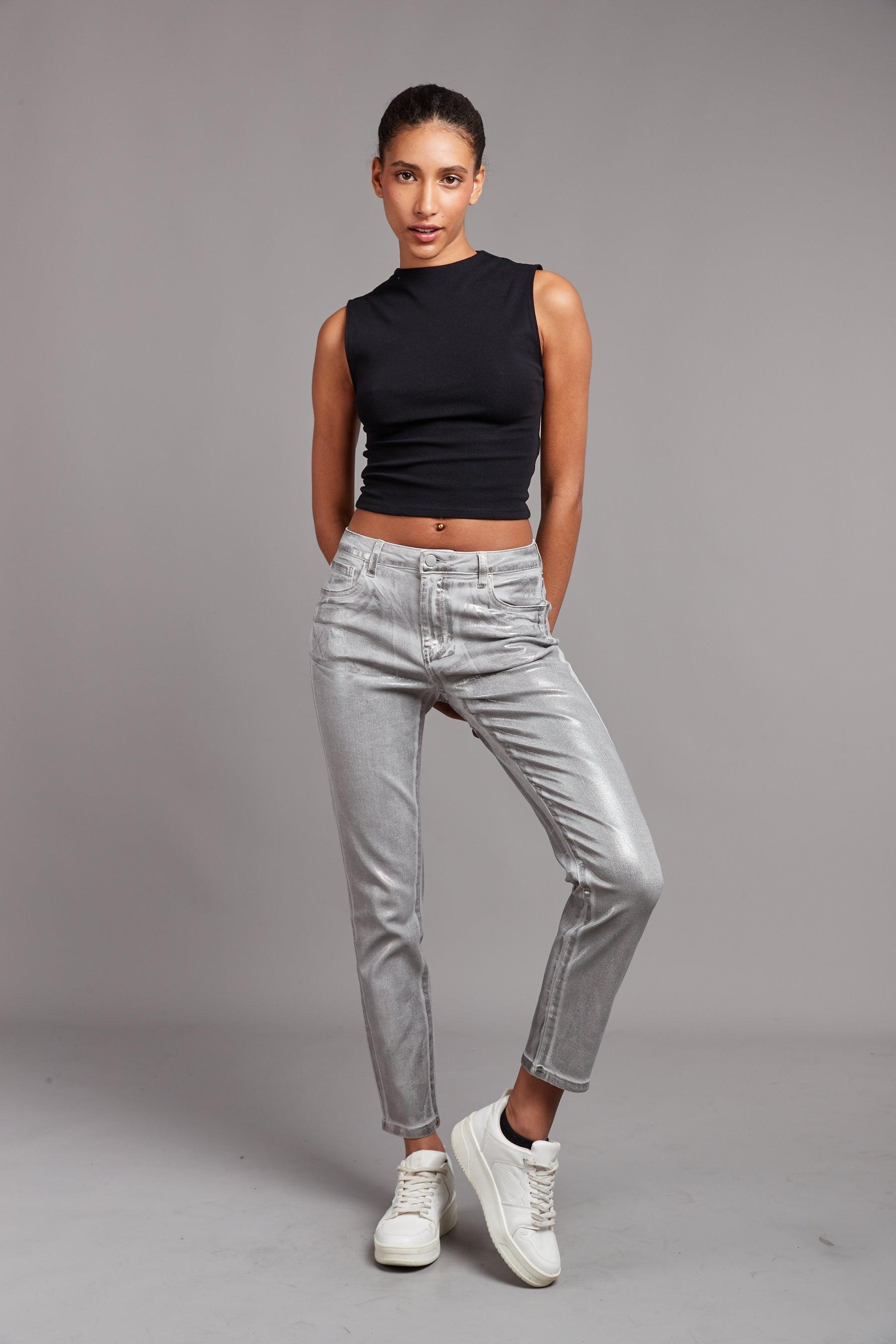 Deze vriendje Jean bij Snee Standaard, metaalcoatingeffect, brengt een moderne en gedurfde aanraking in uw uiterlijk.