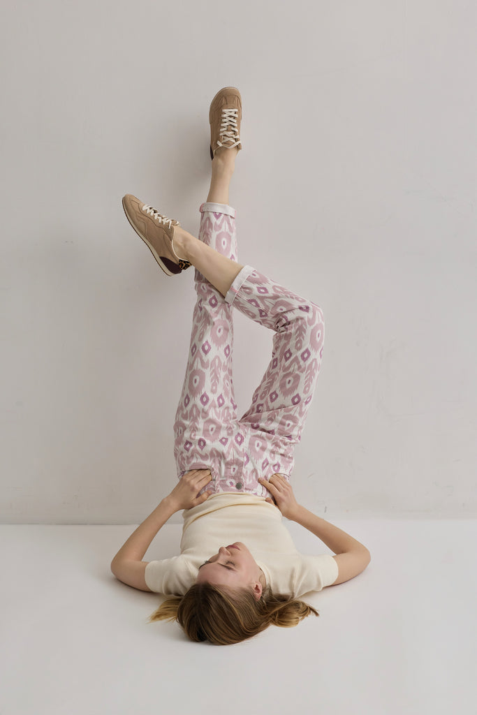 Ce pantalon confectionné dans un tissu stretch confortable propose une coupe de type boy et une fermeture par zip. Il se distingue par son imprimé d'inspiration ethnique et ses tons pastels, disponible en couleur rose ou vert pistache.