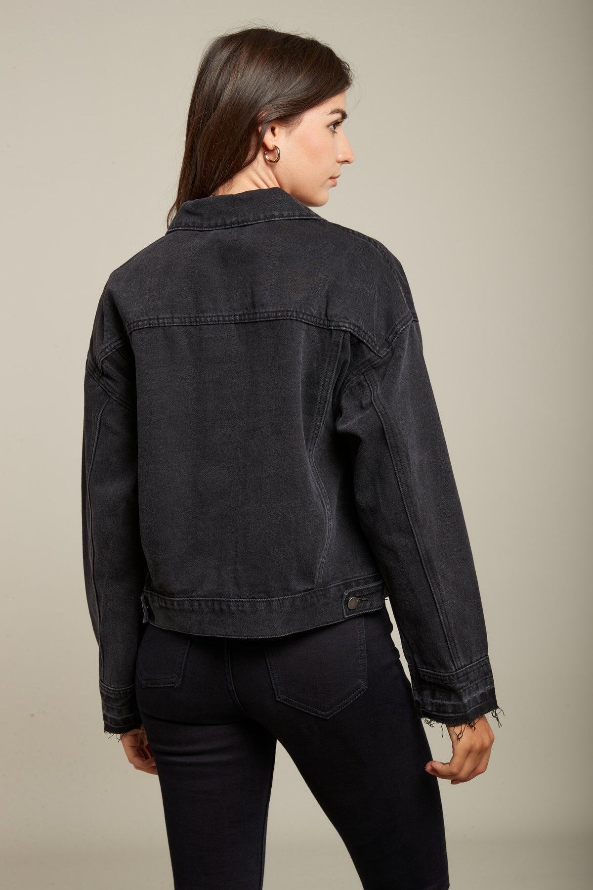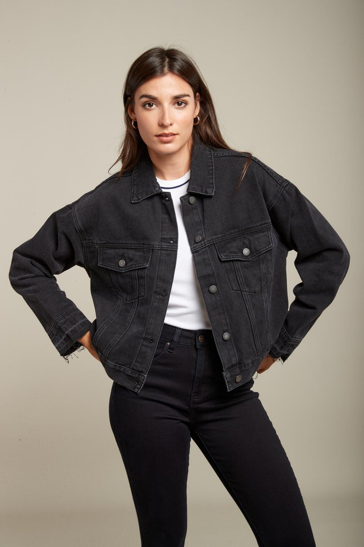Cette veste courte en jean propose une coupe ample, une fermeture à boutons et des manches effilochées.